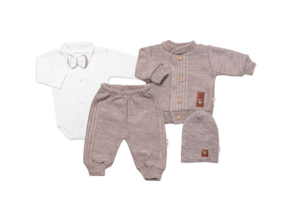 5-dílná pletená sada Baby Nellys, Boy, body, kalhoty, svetr, čepička, motýlek - béžová