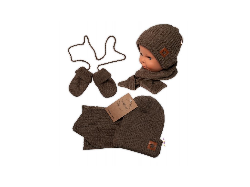 Baby Nellys Pletená čepice s šálou a rukavičky 3v1, STAR - hnědá