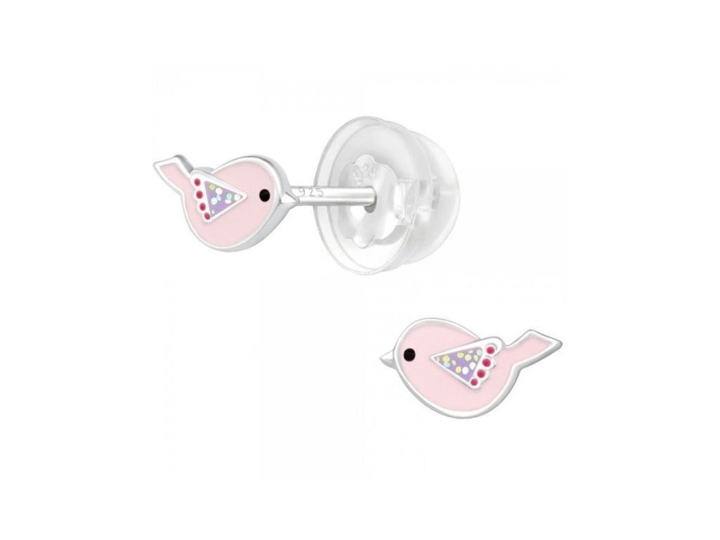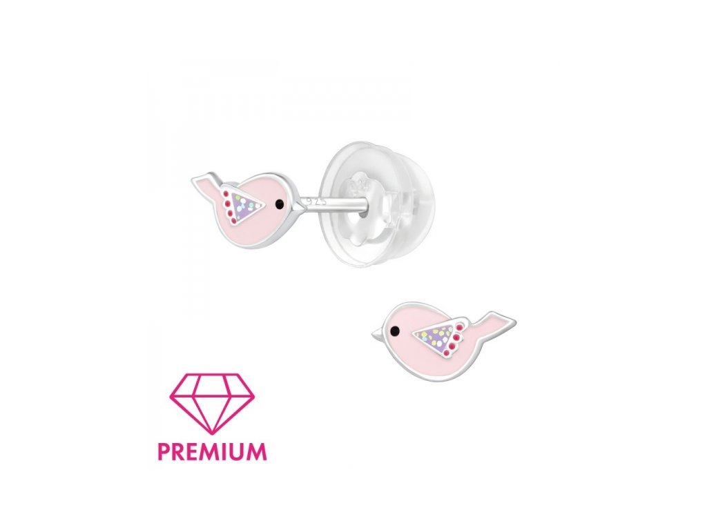 Dětské stříbrné náušničky premium Ptáček růžový, puzetové, silikon