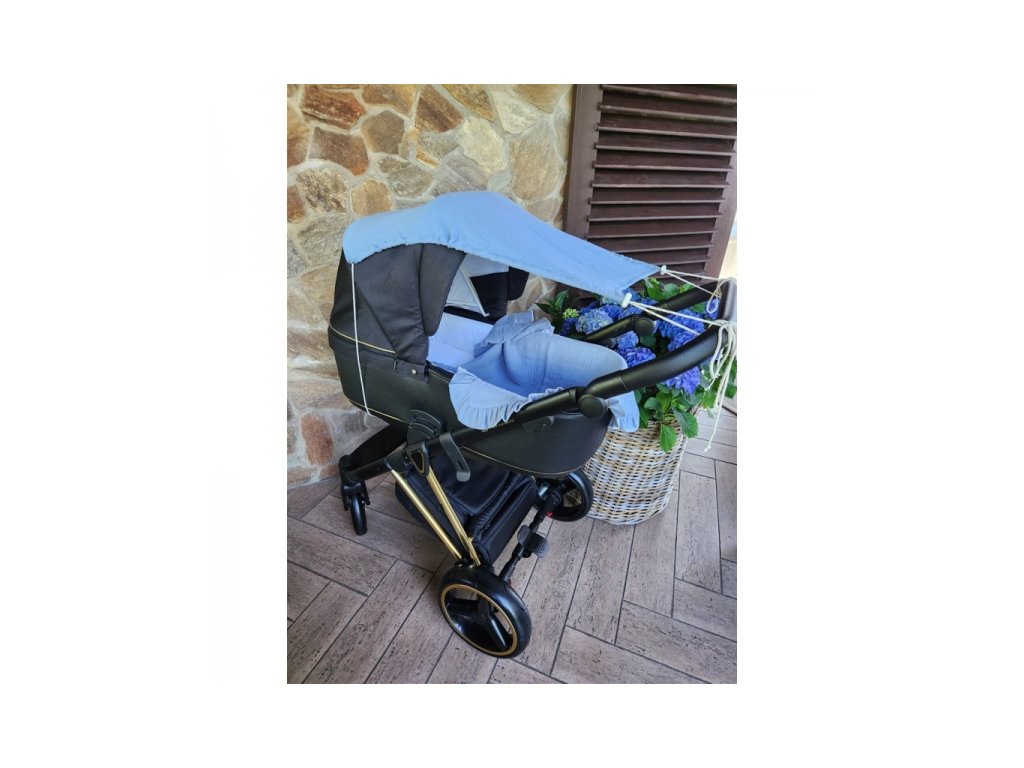Praktická ochranná stříška na dětský kočárek z prodyšného mušelínu (double gauze) – ideální pro jarní a letní procházky.