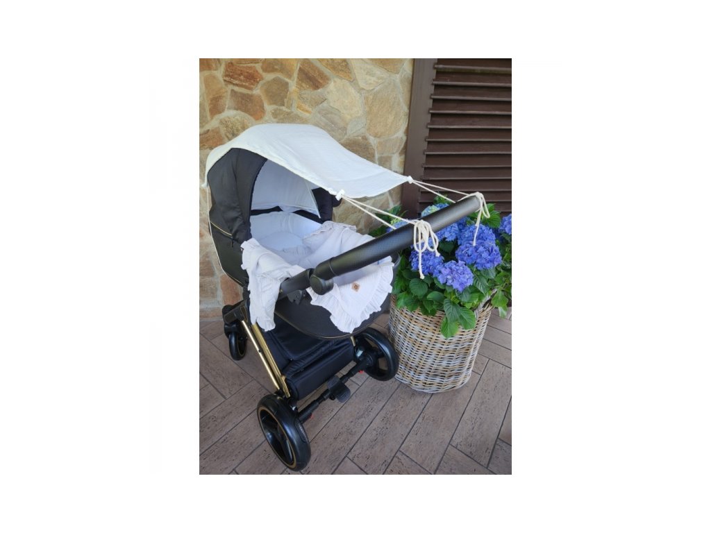 Praktická ochranná stříška na dětský kočárek z prodyšného mušelínu (double gauze) – ideální pro jarní a letní procházky.