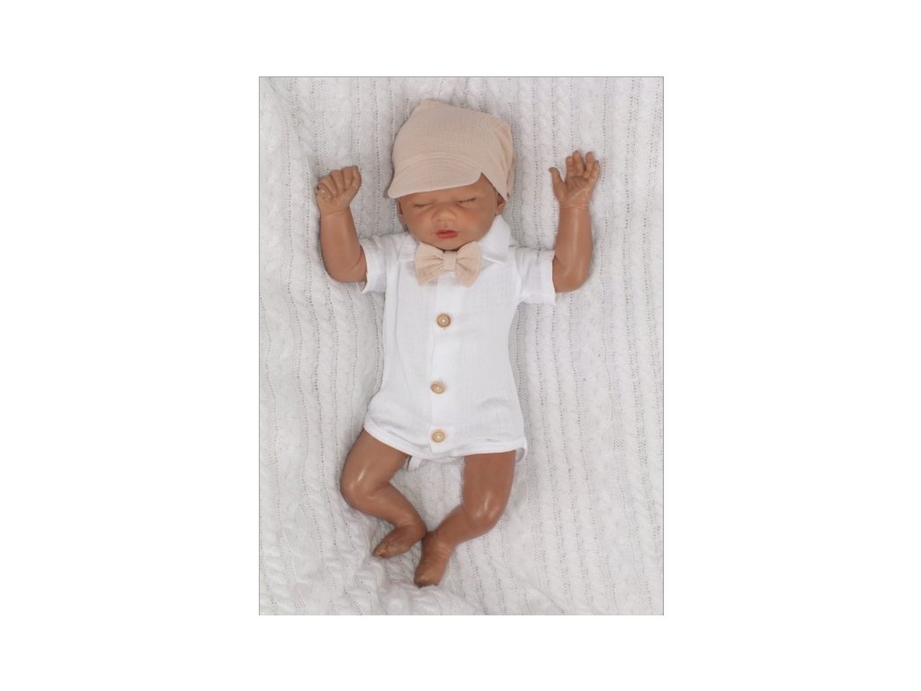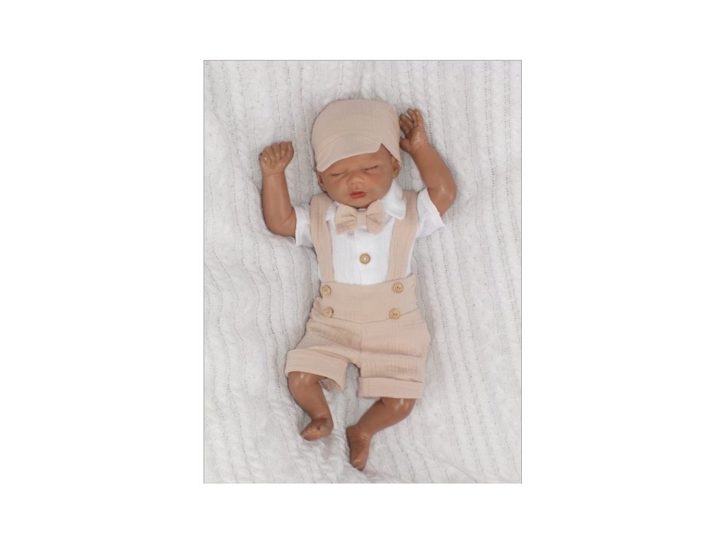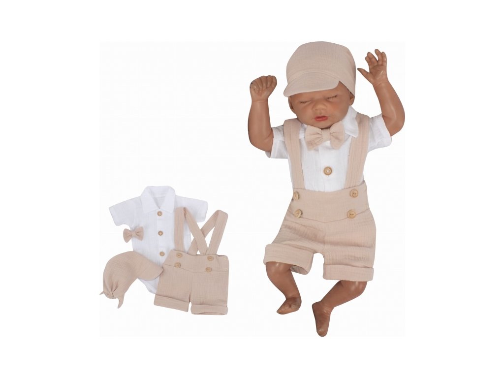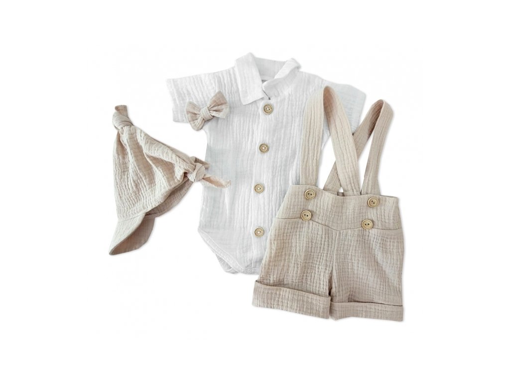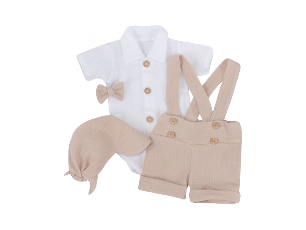 Mušelínové kraťasy s láclem, bodýčko, čepička, motýlek 4D sada, Z&Z, písková/bílá