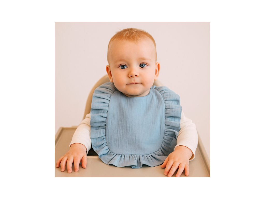 Bryndáček s volánkem Baby Nellys, nepromokavý, vyrobený z jemného mušelínu (dvojitá gázovina), 100 % bavlna.Uvnitř je nepropustná vrstva chránící oblečení před promočením.