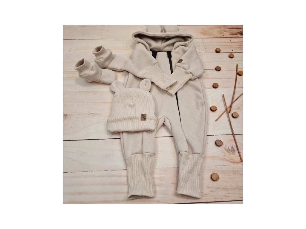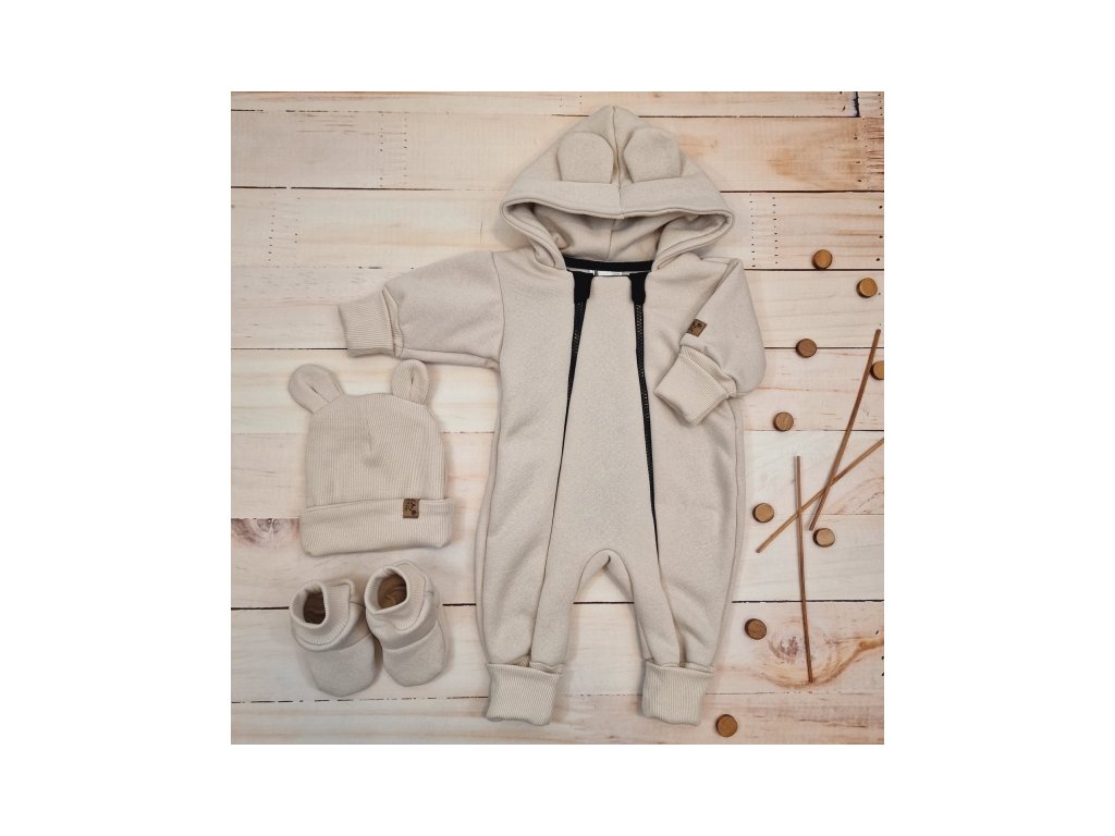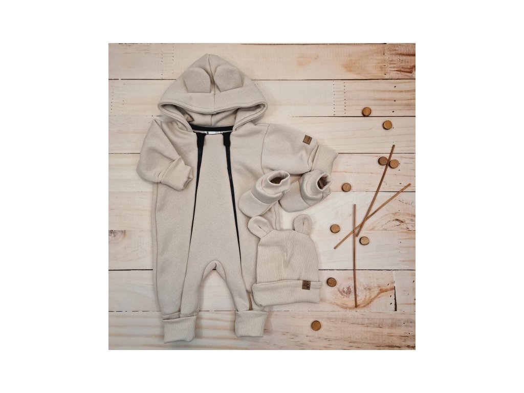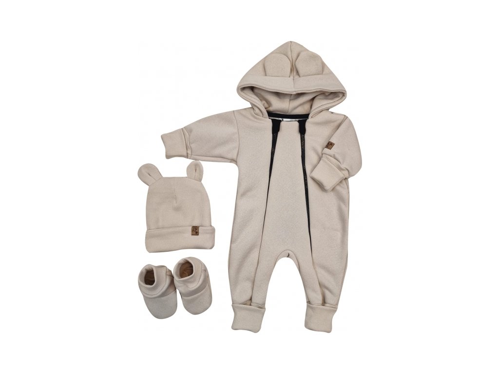 Oteplený dětský overal bez šlapek s kapucí, čepička + botičky, 3D, Kazum, béžový