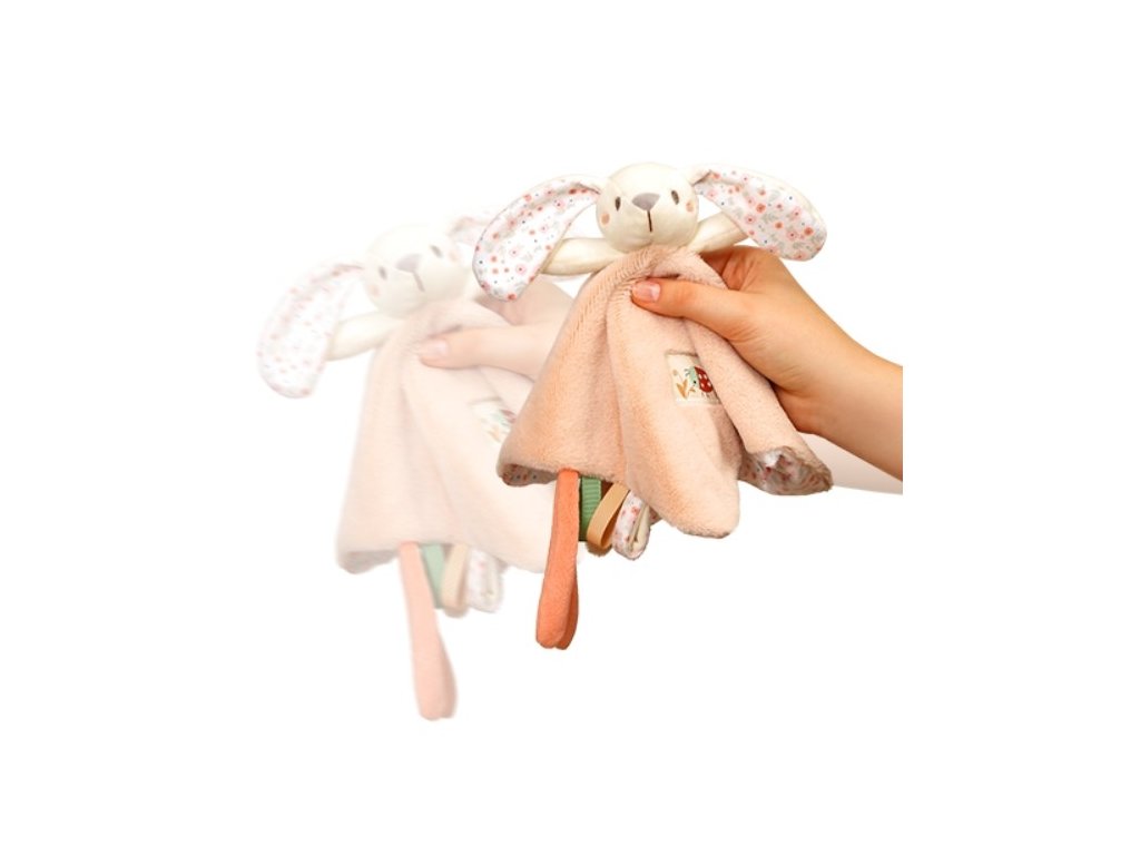 Přítulníček, mazlíček s chrastítkem.Baby Bunny kombinuje deku a plyšovou hračku. Zvyšuje pocit bezpečí – batole má svou oblíbenou hračku vždy na dosah. Stimuluje smysly dítěte. Dlouhé králičí uši a barevné uzly pomáhají rozvíjet obratnost. Malí je také rádi popadnou kvůli různým poutavým barvám a vzorům. Plyšák má tiché chrastítko. Jemně stimuluje sluch dítěte a vzbuzuje jeho zájem. Plyšový materiál deky je velmi jemný na dotek.