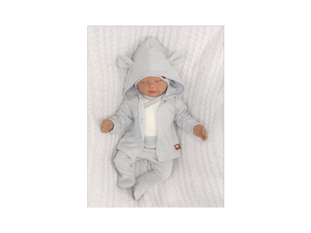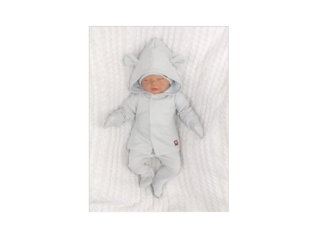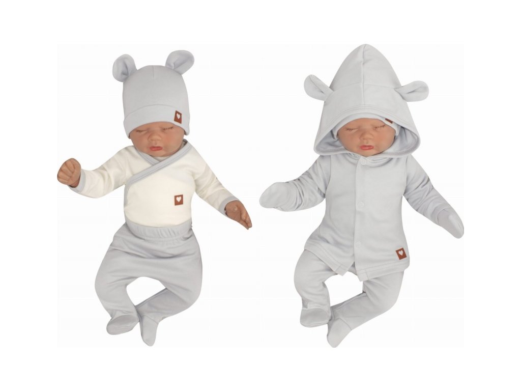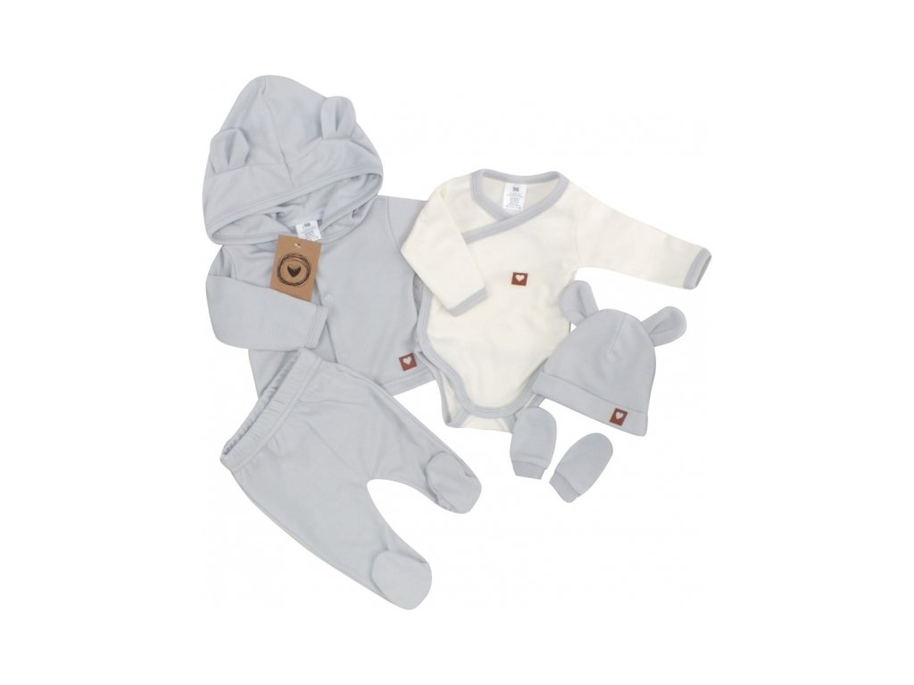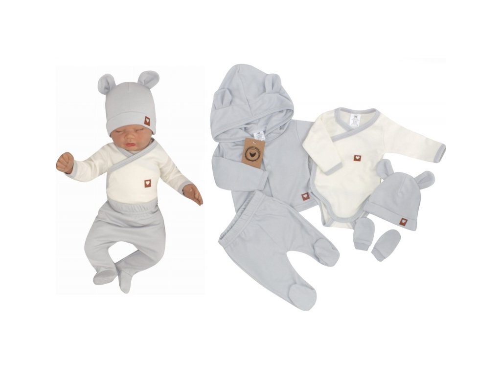 Sada do porodnice 5D, body, polodupačky, kabátek, čepička, rukavičky - šedá