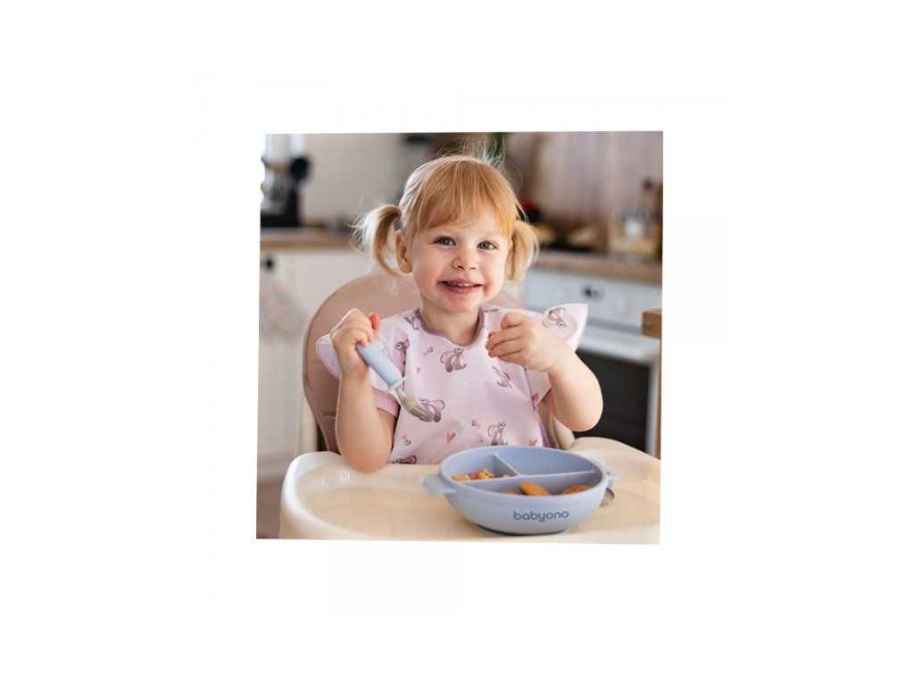 Dělený talíř s přísavkou a víčkem BabyOno – ideální pro zavádění příkrmů a metodu BLW.Tříkomorový silikonový talíř s přísavkou a víčkem je skvělým pomocníkem při zavádění pevné stravy, zejména při používání metody BLW (Baby Led Weaning).