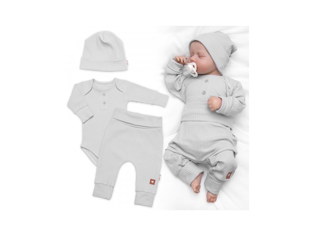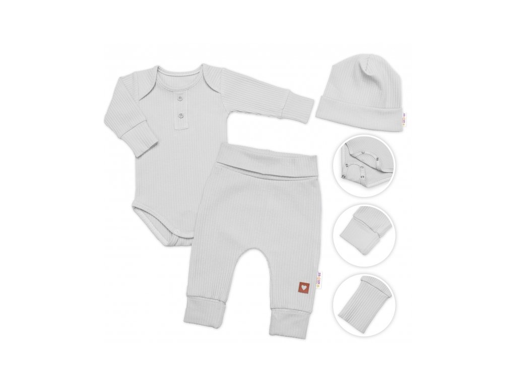 Žebrovaná rostoucí souprava 3D, Baby Boy od české značky Baby Nellys.Sada obsahuje: tepláčky, body s dlouhým rukávkem a čepičku.
