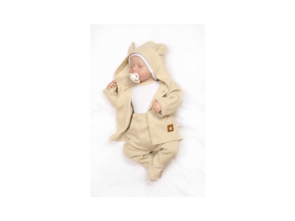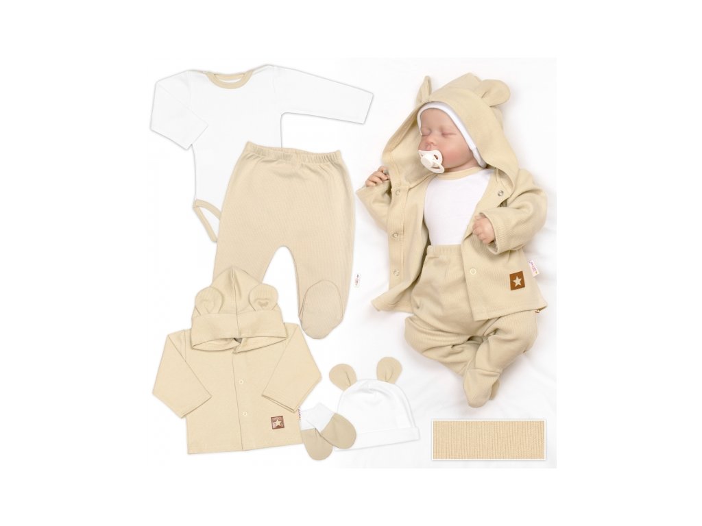 Žebrovaná sada, Star 5D, body, polodupačky, kabátek, čepička, rukavice - bílá, béžová