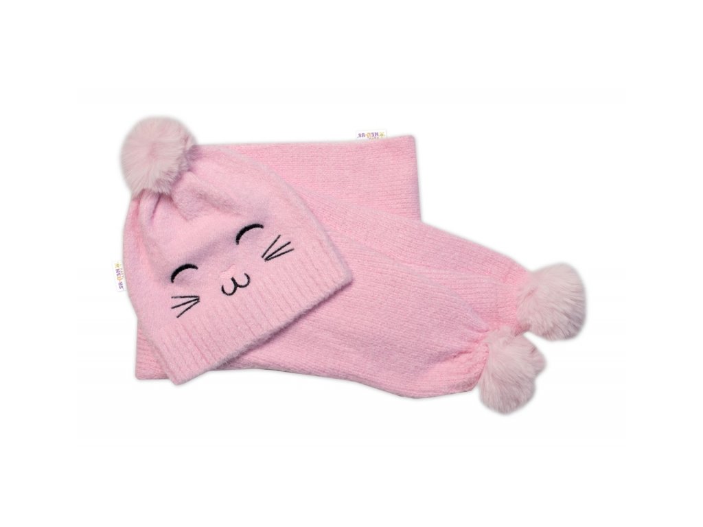 Zimní čepice s bambulí + šál, Kitty, Baby Nellys - růžová, vel. 54/58